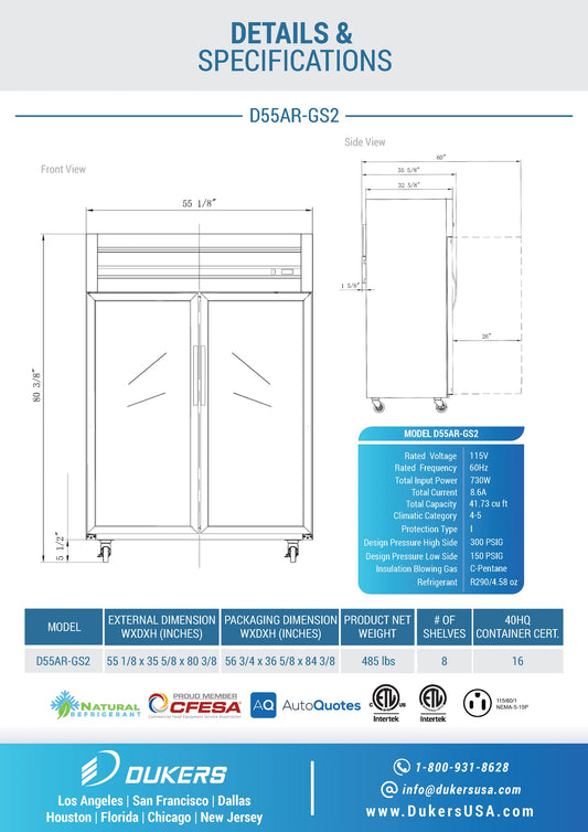 D55AR-GS2 Top Mount Glass 2-Door Commercial Reach-in Refrigerator